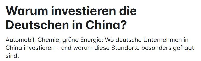 中國對德國投資者有哪些吸引力?德國外交部授權(quán)設(shè)立的跨媒體平臺deutschland.de近期發(fā)布一篇題為《德國人為何在中國投資?》的文章,對此進(jìn)行了歸納和分析。