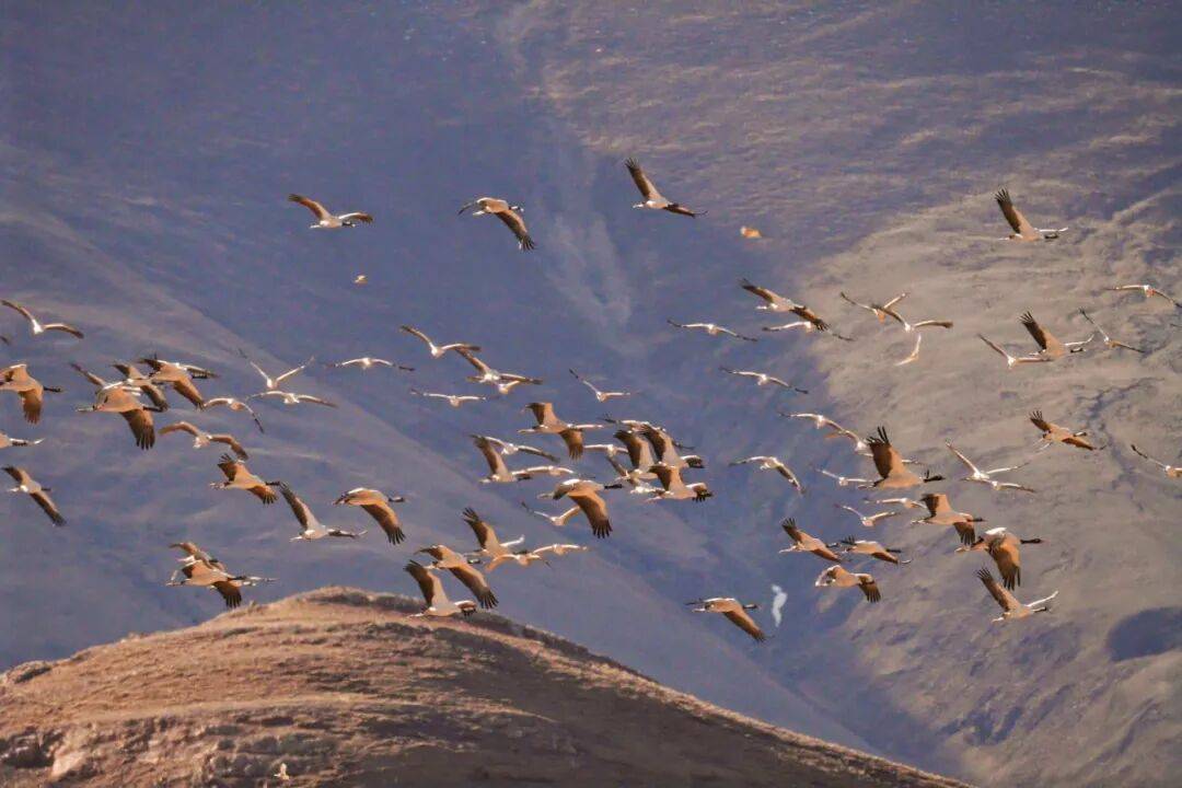 黑頸鶴有著修長的脖頸和雙腿,全身灰白相間,頭頂一抹紅色格外醒目。它們在田野間悠然覓食,時而翩翩起舞,時而引頸高歌,形成一幅動人的生態(tài)畫卷。